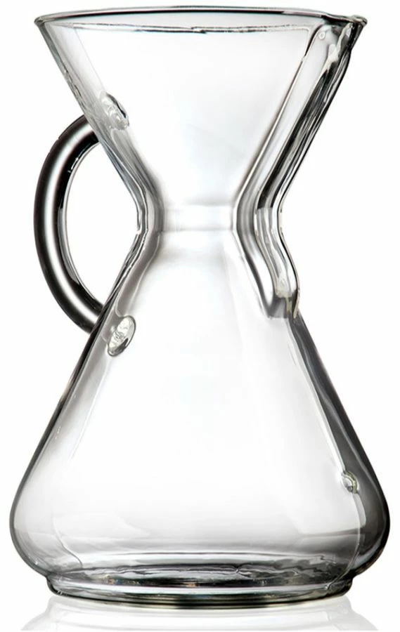 The Chemex Glass Handle coffeemaker is an elegant, one-piece, hourglass shaped vessel made of high quality, heat resistant glass with a glass handle.