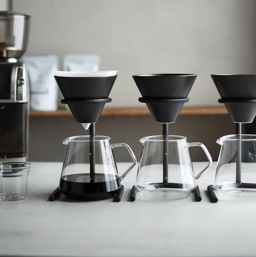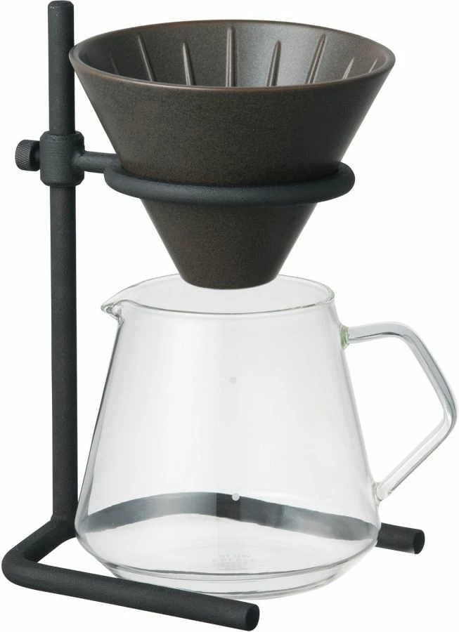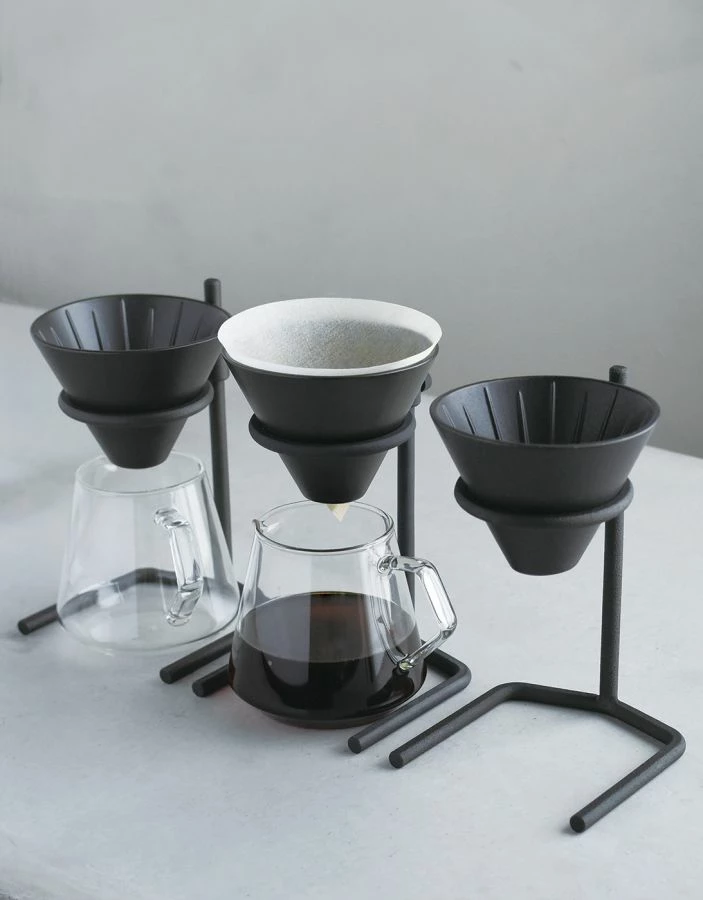 Brewer stand – Made by casting, the brewer stand intrigues with its rough look. It comes with a porcelain brewer with glaze rich in texture. The height of the stand can be adjusted, letting you use it with avarious vessels from a mug to a tall server.