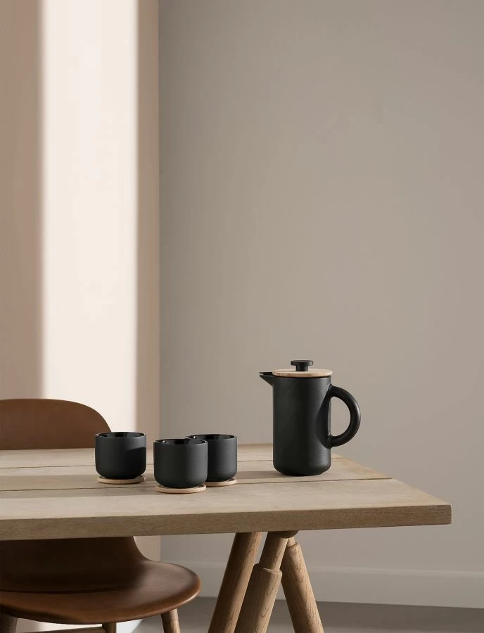 Stelton’s Theo French press is made of dark, rustic stoneware, and the inside has been coated with a shiny glaze that creates a beautiful contrast with the black matte surface. The lid is made of bamboo. Designed by Francis Cayouette.